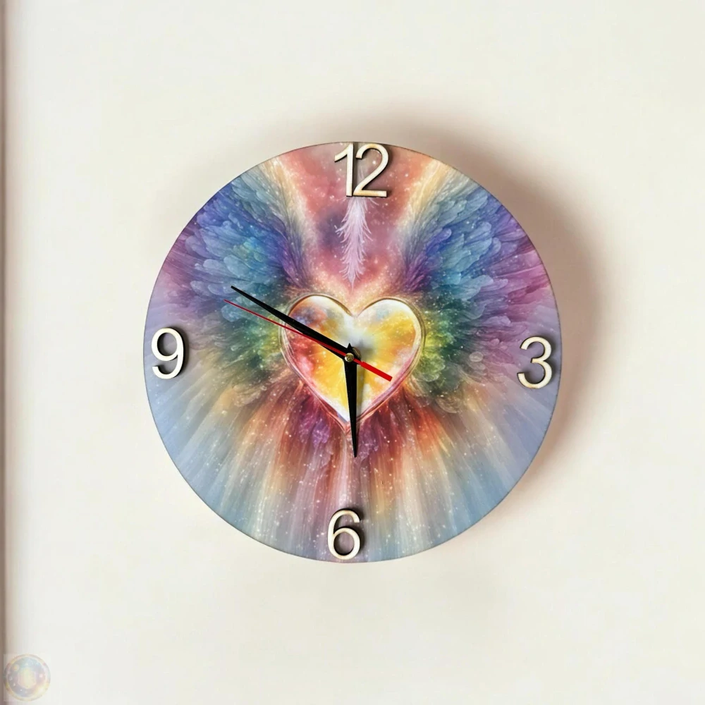 Propojte užitečnost s uměním a vytvořte ve svém domově harmonickou atmosféru. Tyto originální nástěnné hodiny jsou zdobené naším velmi oblíbeným obrazem Srdce s duhovými křídly.