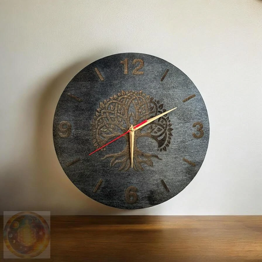 Tyto designové nástěnné hodiny s jemně gravírovaným Stromem života spojují přírodní symboliku s precizní ruční prací. Každý kus je originál, vytvořený s láskou a respektem. Černý strukturovaný povrch podtrhuje kontrast gravury a dodává hodinám hloubku a noblesu.
