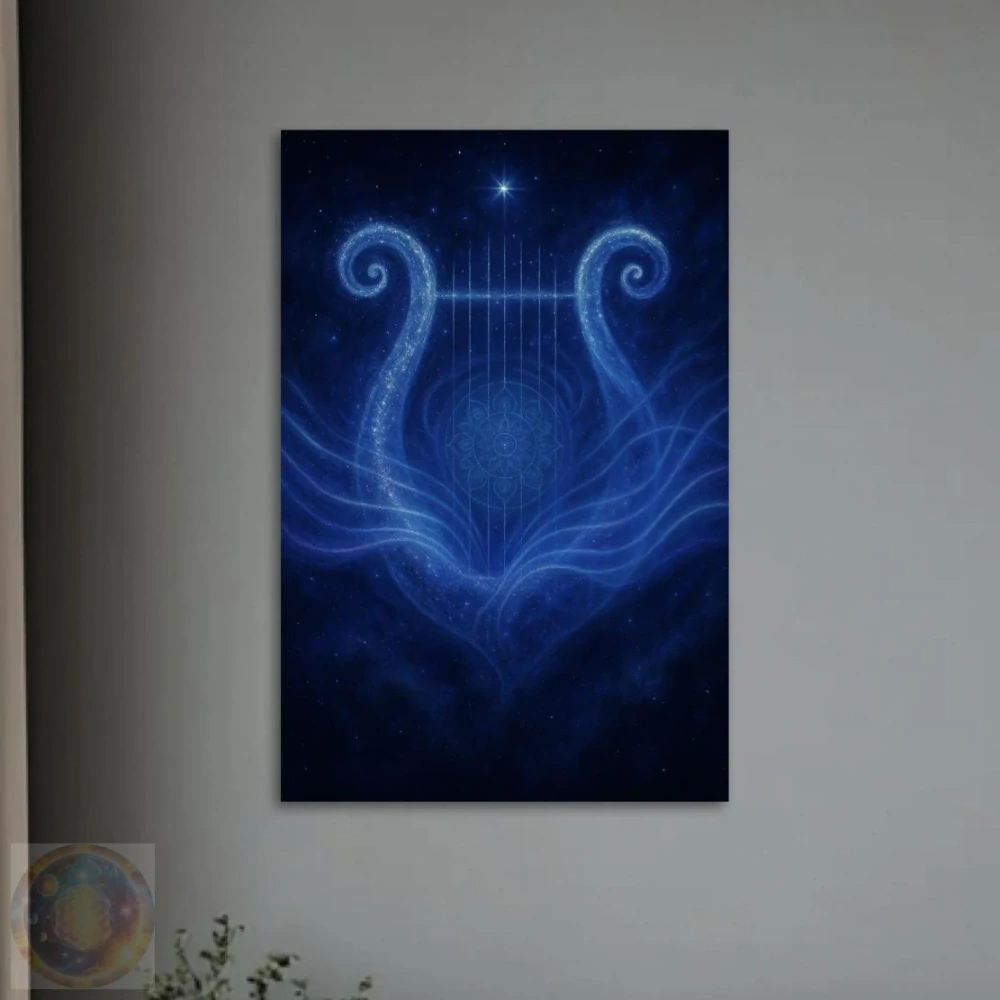 Tento obraz je symbolem harmonie, inspirace a propojení s rytmem života. Uprostřed obrazu se z vesmírného prachu zjevuje kosmická lyra – nástroj, který hraje tóny, jež cítíme spíše srdcem než ušima. Její světelné struny vysílají jemné vlny do prostoru a připomínají, že celý vesmír má svůj řád a melodii, na kterou se můžeme naladit. Hluboké tóny modré a fialové přinášejí klid a soustředění, zlaté a bílé jiskry dodávají energii a jasnost. Tyrkysové a stříbrné odlesky podporují otevřenou mysl a proud nové inspirace.
